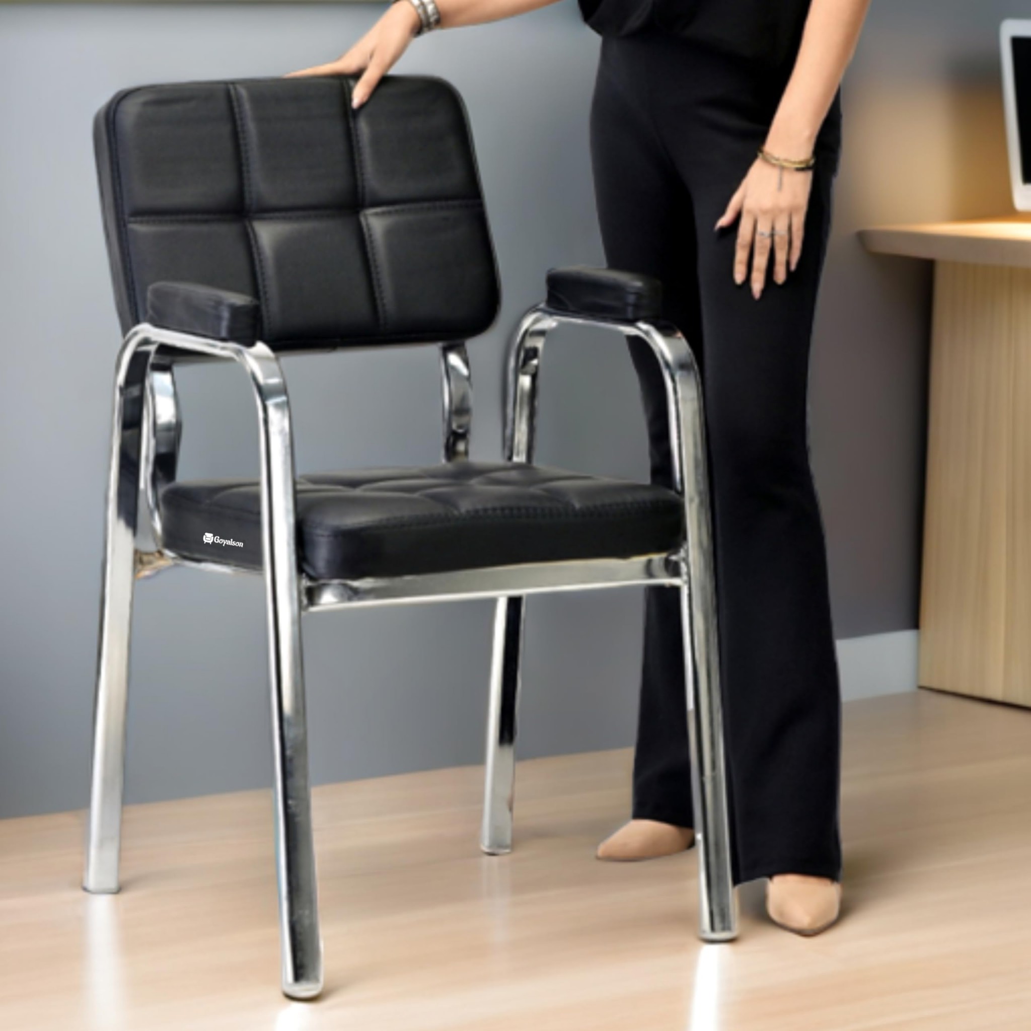chrome plated silver color frame cushion black color rexine designer seat medium half back rest fix armrest 4 legs office designer visitor fix chair