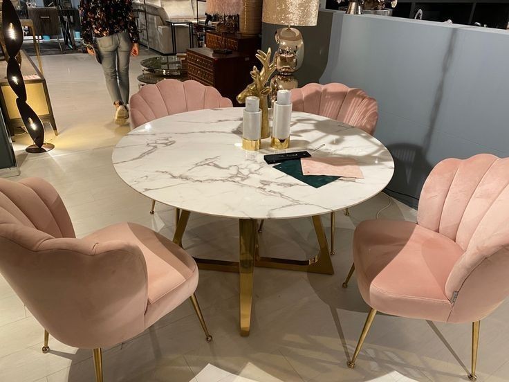 Stainless steel rose gold finish base with round shape white color onxy marble top wooden frame chair with metal powder coated golden finish legs cushion pink color velvet seat fingers back arm less designer 4 seater hotel and restaurant dining table set manufacturer and designer