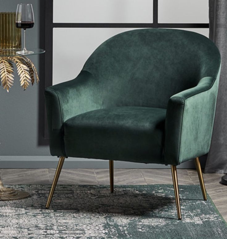 Teak wood brown color polished frame metal powder coated golden finish legs cushion velvet green color seat round shape medium back with joint armrest designer home and hotel single seater sofa manufacturer and designer