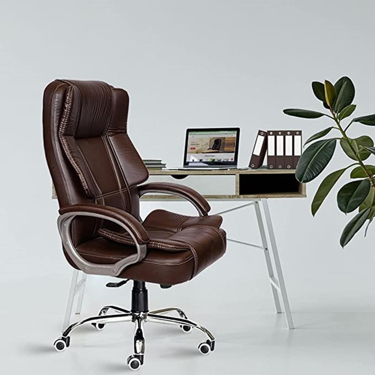 ply wood frame cushion Pu leather brown color cushion seat high back foxed handle with PU cushion revolving adjustable height chrome plated 5 wheels base office boss chair manufacturer and designer