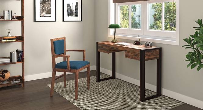 Teak wood brown color polished frame cushion fabric blue color seat medium back fixed handle home wooden 4 legs visitor type study chair manufacturer and designer