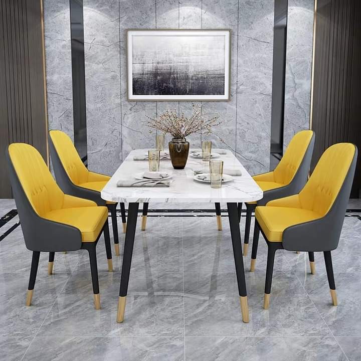 teak wood black color 4 legs white color Indian marble on top in 4.5'L x 2.5'W x 2.5'H wooden frame chairs with leather seat yellow and grey color chairs 4 seater designer marble top dining table set manufacturer and designer