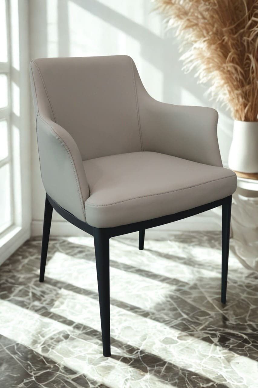 Teak wood frame cushion PU leather ivory color seat wooden black color polishing 4 legs medium back home and hotel designer armrest dining chair manufacturer and designer