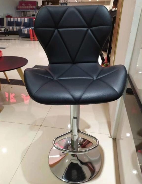 Ply wood frame cushion black color rexine seat low back arm less designer seat single rod support adjustable height, maximum 32 inches height chrome plated round shape base revolving office, bar, home, cafeteria and restaurant bar stool manufacturer and designer