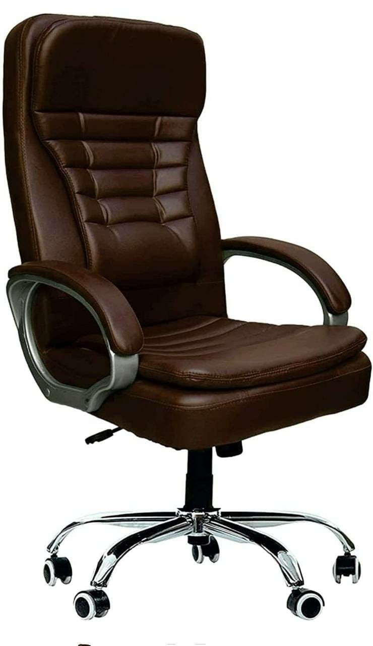 ply wood frame cushion leather brown color seat high back fixed handle with cushion pads adjustable height revolving chrome plated 5 wheels base office executive boss chair