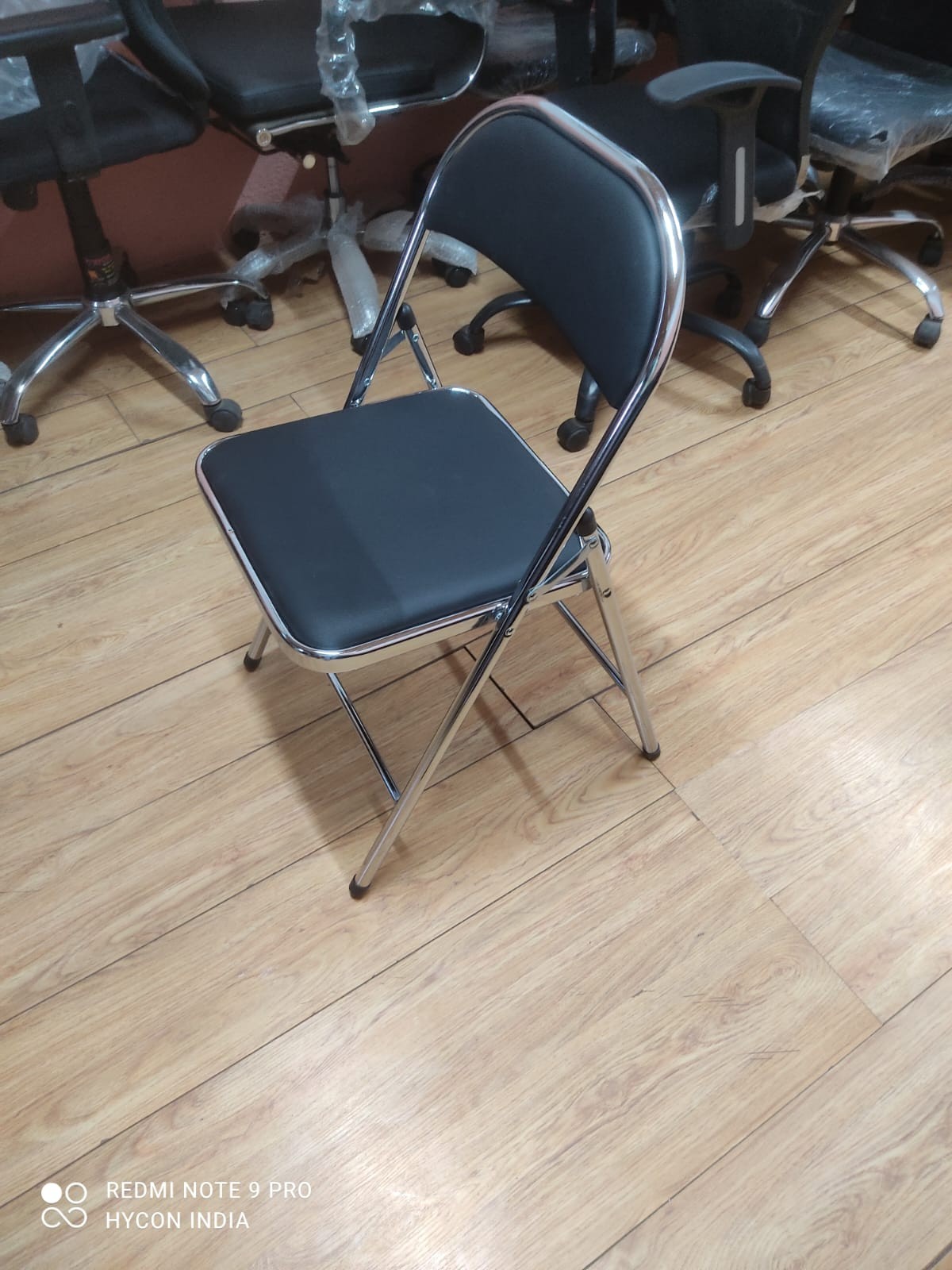 Chrome plated silver color finish medium back arm less and footrest designer home cushion leather black color seat folding chair manufacturer and designer
