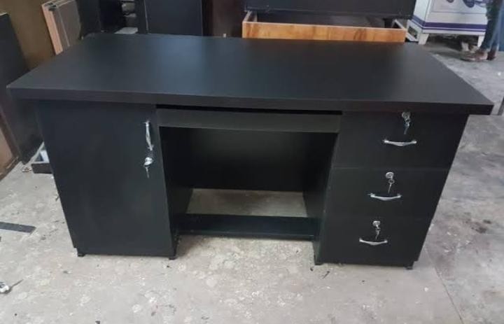 Engineered Wood polished brown color frame 3 drawer with key lock and 1 storage box with key lock 4'L x 2'W x 2.5'H designer Rectangular shape with key pad and foot rest Office table manufacturer and designer