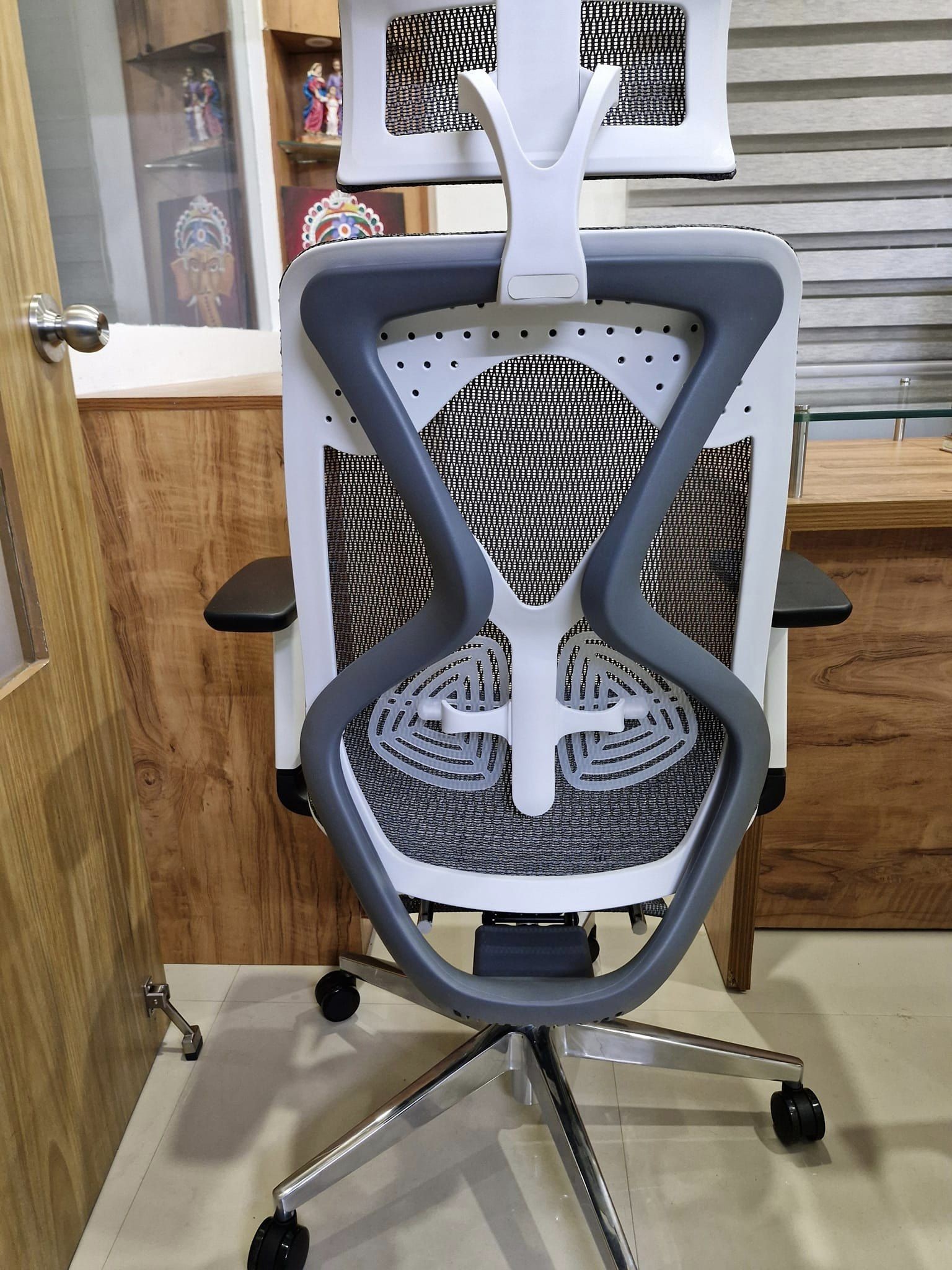 High back designer back with headrest adjustable white color handle adjustable height revolving chrome plated 5 wheels base office ergonomic director or executive boss chair manufacturer and designer