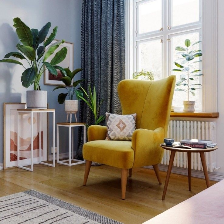 Teak wood brown color polished frame cushion velvet yellow color seat High back curve shape armrest designer home and hotel lounge chair manufacturer and designer