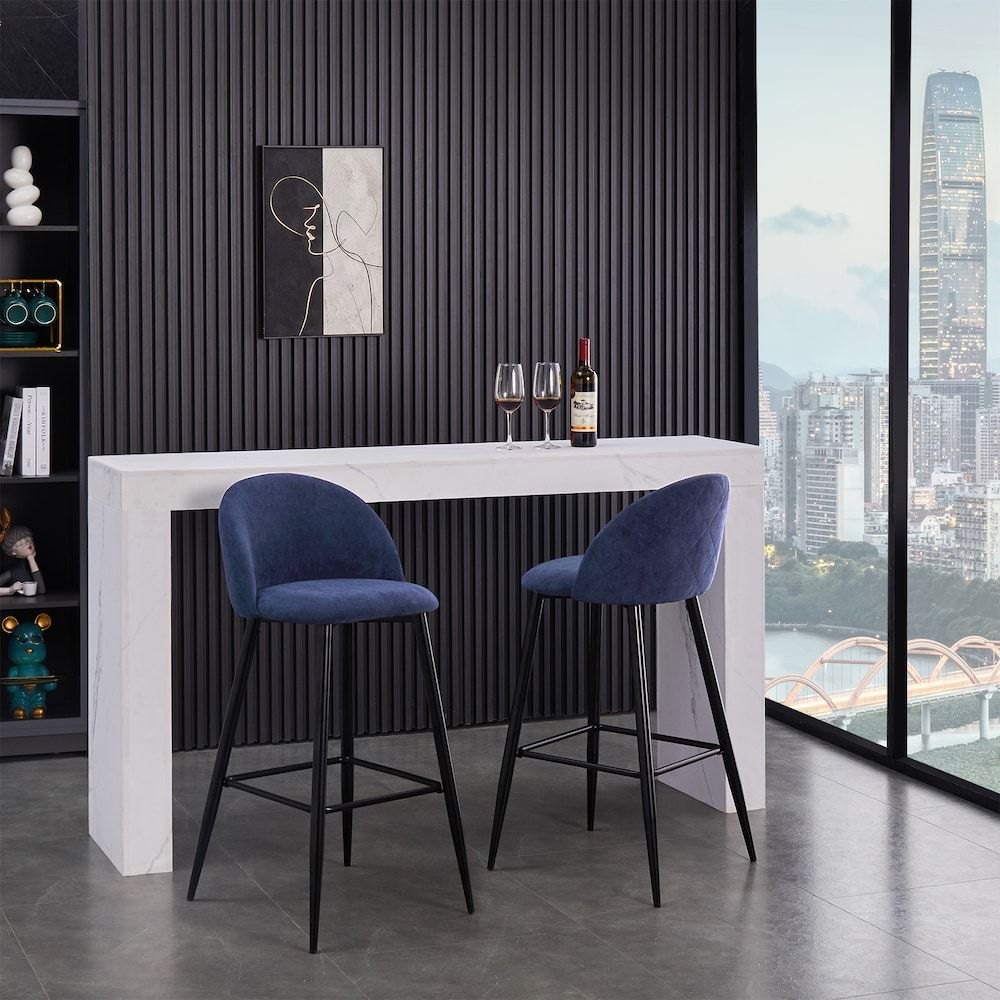 Teak wood seat frame cushion velvet blue color round seat and low round black metal powder coated black color 4 legs with footrest 30 inches height home, restaurant, office, bar and hotel bar counter chair manufacturer and designer