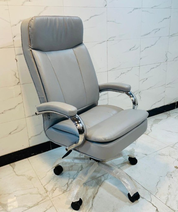 Ply wood frame cushion PU leather grey color seat high back with headrest cushion chrome fixed round shape handle comfortable seat adjustable height chrome plated 5 wheels base revolving office executive office chair manufacturer and designer