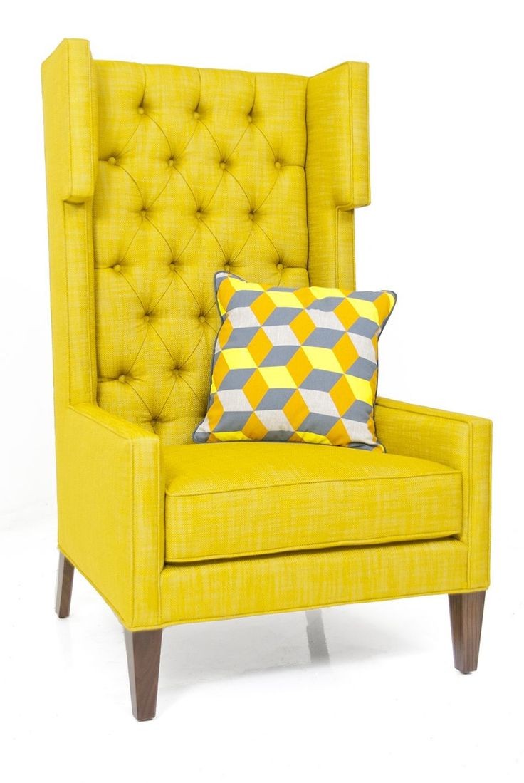 Teak wood brown color polished frame cushion fabric yellow color seat designer diamond high back with fixed straight armrest 4 legs home and hotel lounge living room chair manufacturer and designer