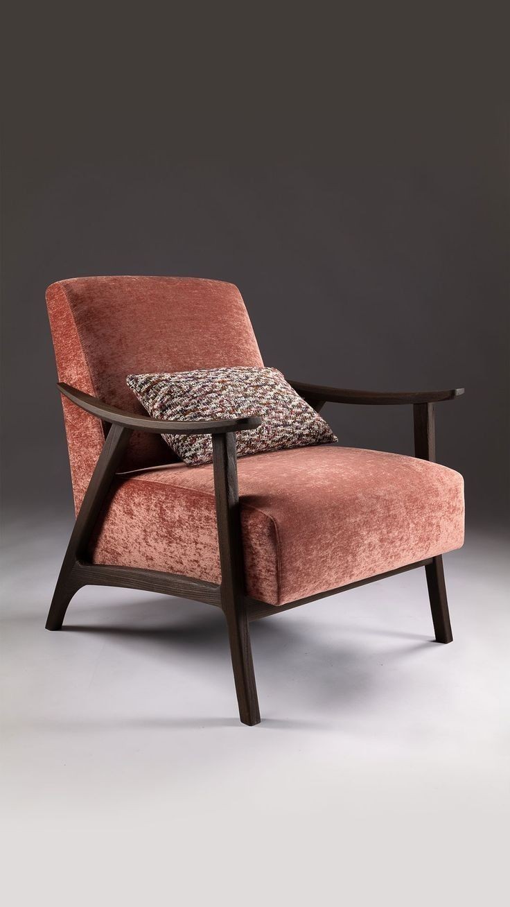 Teak wood brown color polished frame cushion velvet pink color seat medium back home and hotel designer living room lounge chair manufacturer and designer