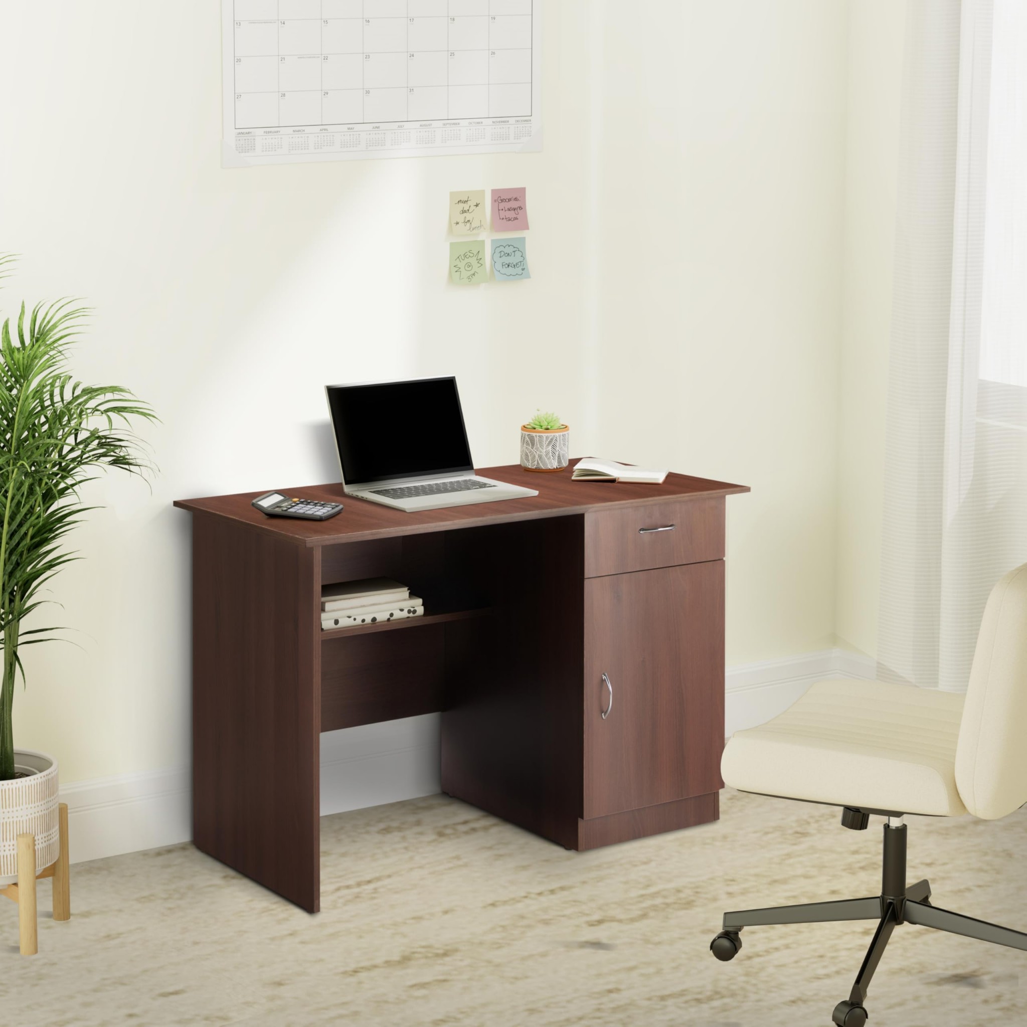 Engineered wood brown color body single drawer with key lock system and single storage 4'L x 2'W x 2.5'H designer book keeping shelf home and office computer and study table manufacturer and designer