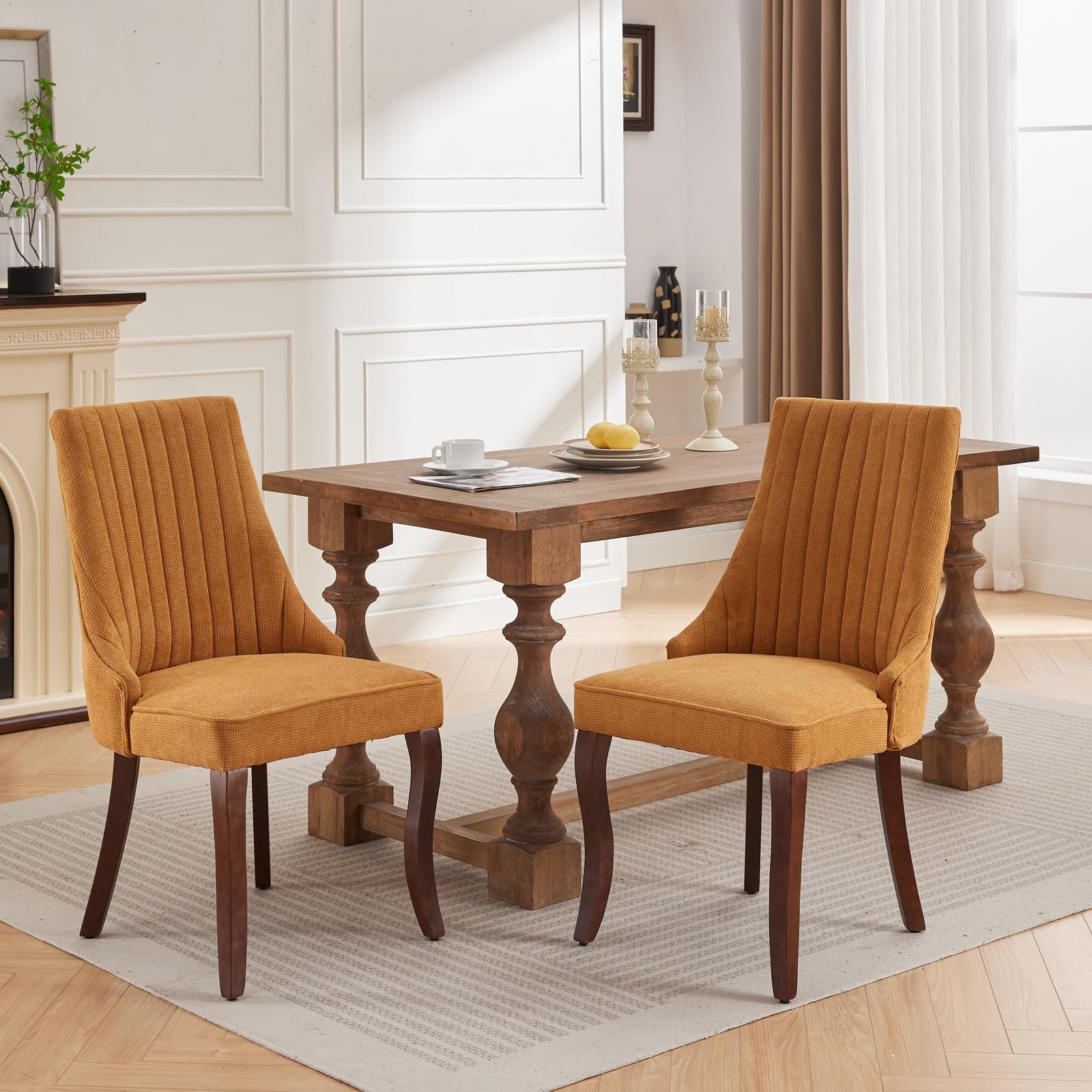 Teak wood brown color polished frame cushion velvet orange seat designer lines back medium back arm less home, hotel and restaurant dining chair manufacturer and designer