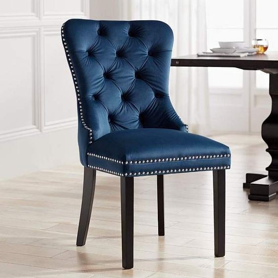 Teak wood brown color polished frame cushion velvet blue color seat medium back arm less designer button back home, hotel and restaurant dining chair manufacturer and designer