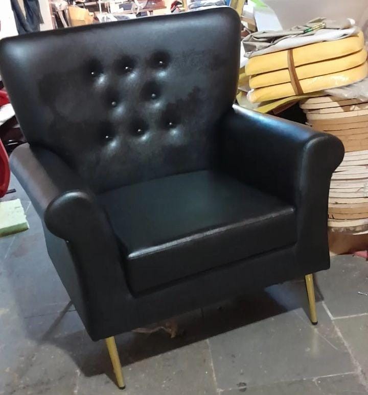 teak wood 4 legs leather cushion black color seat armrest buttons on back designer home and hotel lounge chair manufacturer and designer