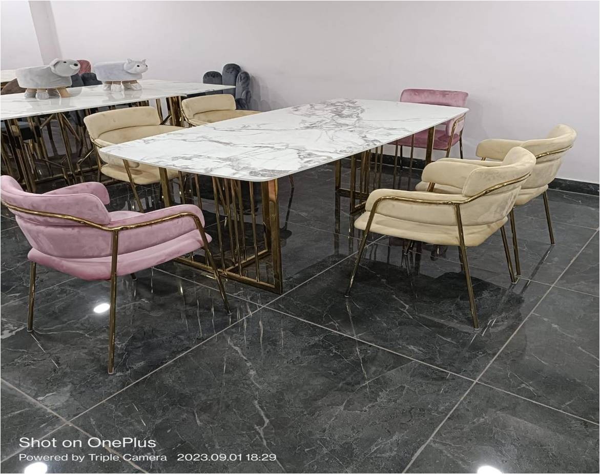 Stainless steel rods gold rose polish onxy white color designer marble on top metal frame of chair with velvet seat armrest 5'L x 3'W x 2.5'H home and hotel 6 seater luxury marble top dining table set manufacturer and designer