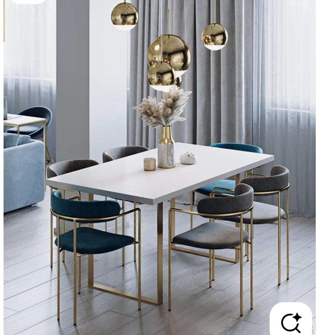 Metal frame rose gold finish white color marble on top 5'L x 3'W x 2.5'H metal frame cushion seat with round armrest medium back 6 seater grey and blue color velvet seat designer home and hotel dining table manufacturer and designer
