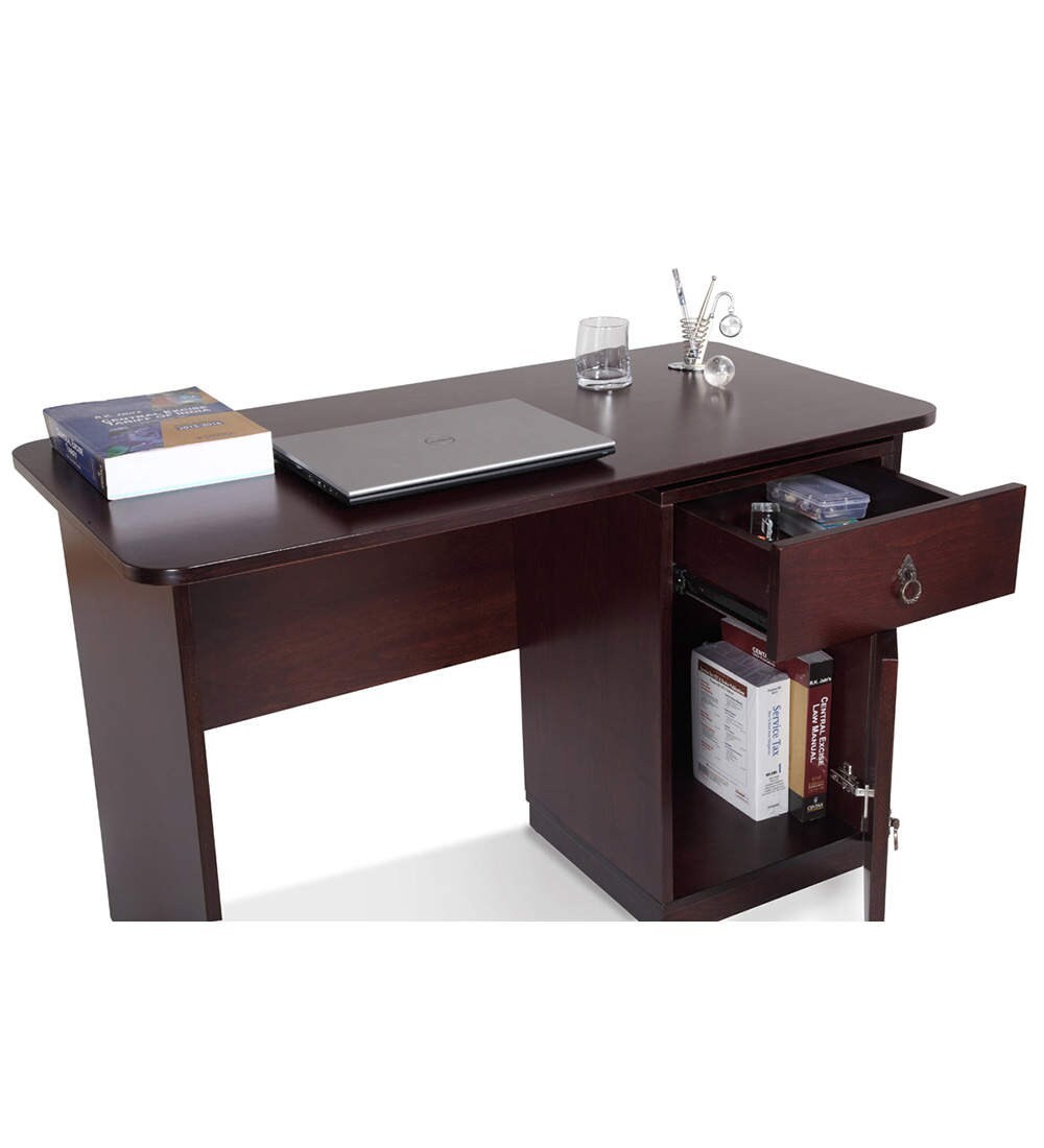 Engineered wood brown color body single drawer with key lock system and single storage 4'L x 2'W x 2.5'H designer book keeping shelf home and office computer and study table manufacturer and designer