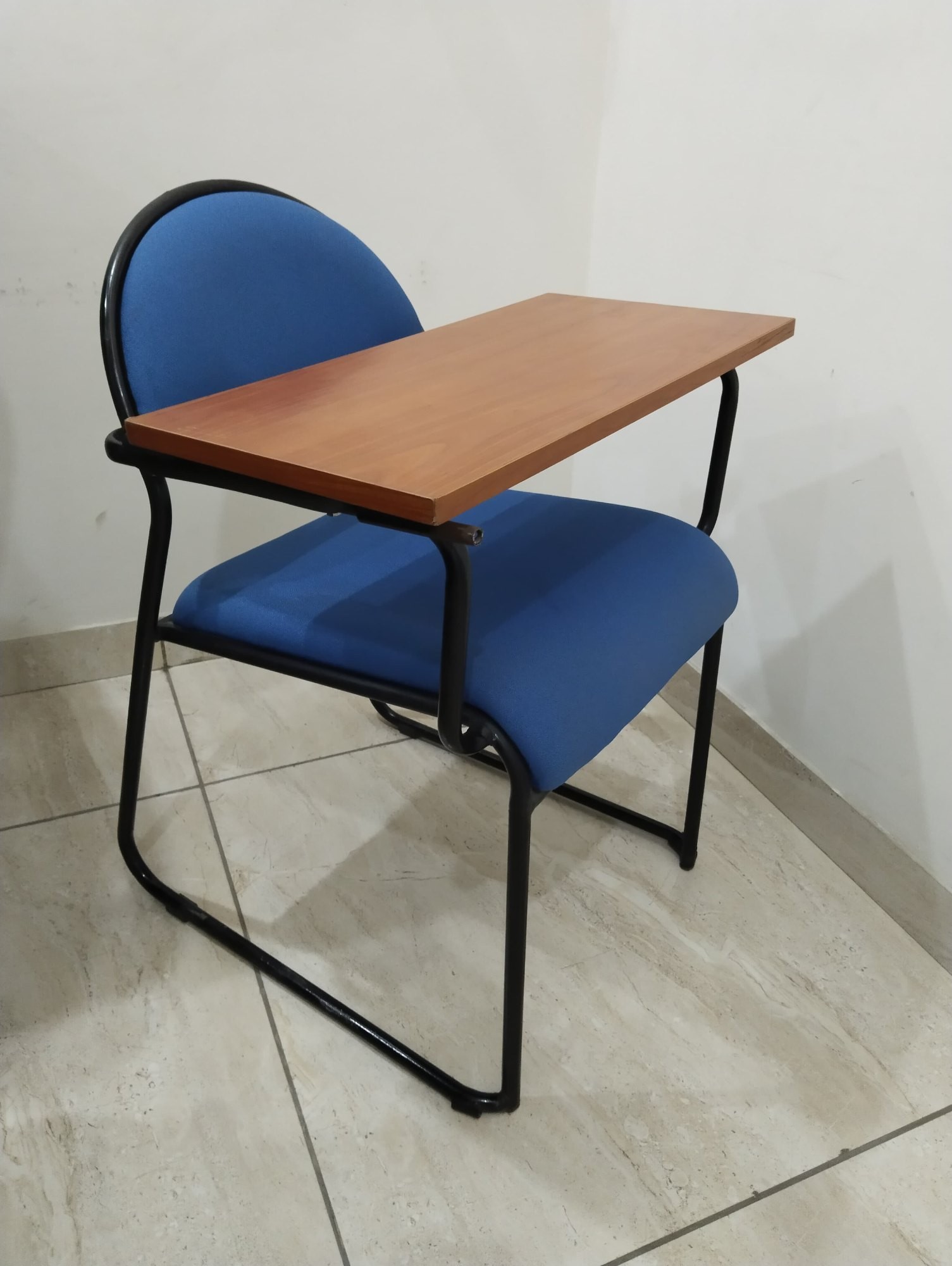 metal powder coated black color body cushion fabric blue color seat half medium back with armrest and wooden rectangular shape visitor type writing pad student chair
