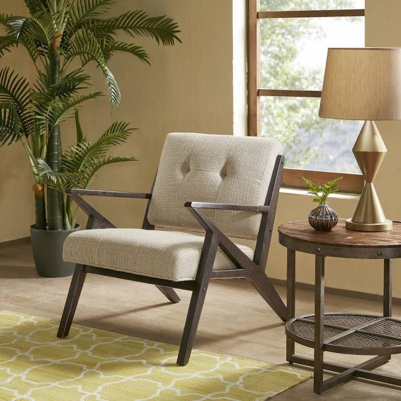 teak wood brown color polished frame armrest ivory color fabric designer seat fixed handle home and hotel lounge chair manufacturer and designer