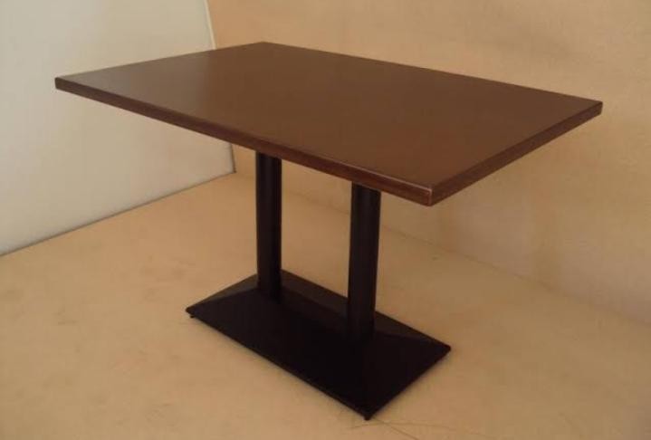 Metal powder coated black color rectangle shape base with two rod support engineered wood brown color rectangular shape top 4'L x 2'W x 2.5'H 4 seater hotel, restaurant and cafeteria table manufacturer and designer