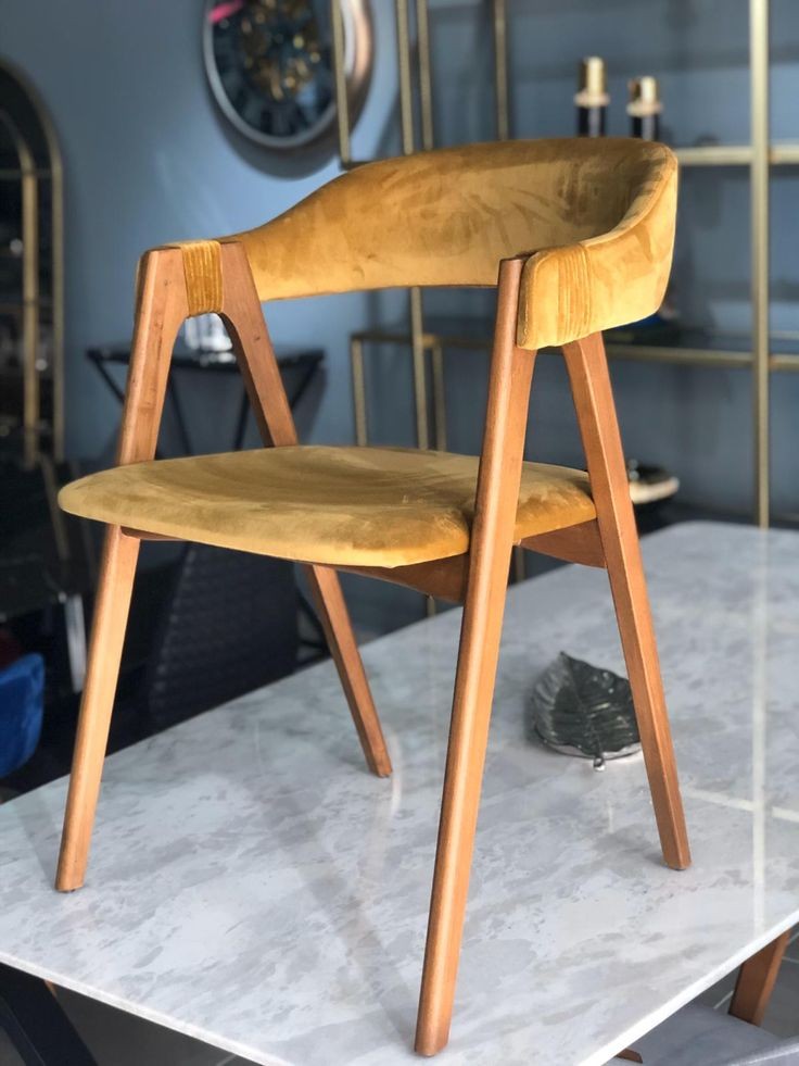 Teak wood brown color polished frame cushion velvet yellow color seat medium half back with armrest 4 legs designer home and hotel dining chair manufacturer and designer