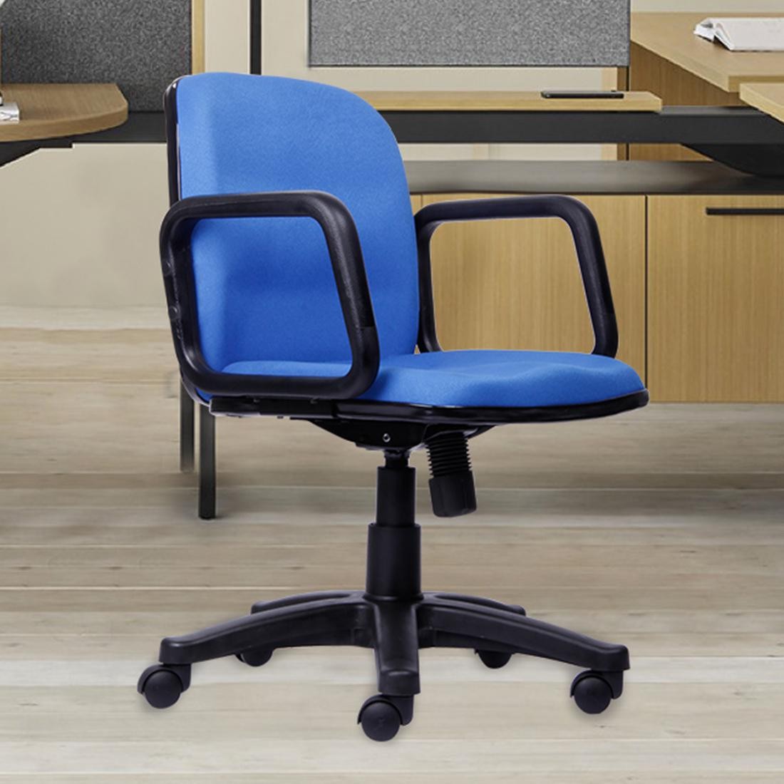 Metal powder coated black color frame cushion blue color fabric seat medium back fixed black color handle adjustable height nylon 5 wheels base revolving office staff and conference room chair manufacturer and designer