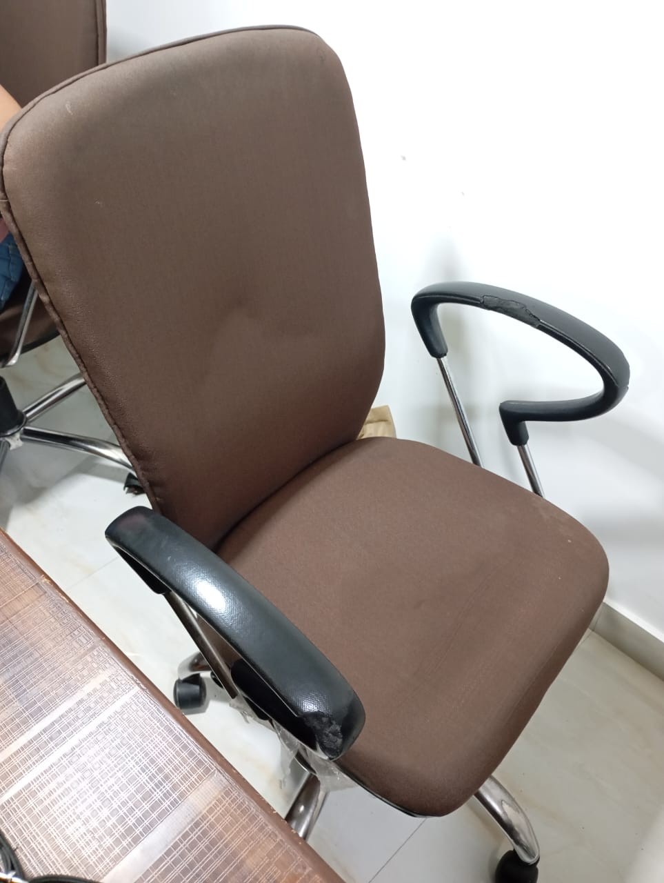 medium back ply wood cushion fabric brown color seat and back with fixed steel handles adjustable height revolving chrome plated 5 wheels base office conference room chair and staff chair
