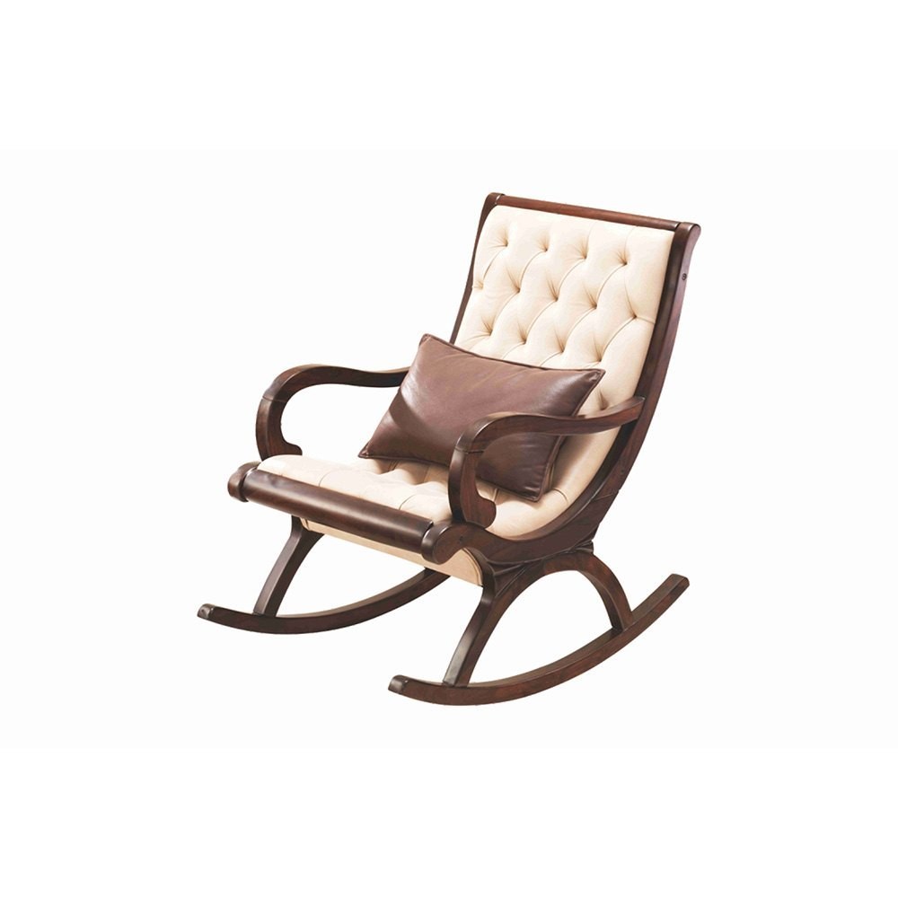 Teak wood green color polished frame cushion ivory color diamond back cushion pads on arm round armrest high back and footrest home and hotel designer rocking chair manufacturer and designer