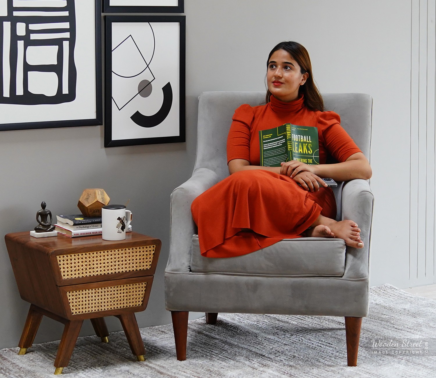 Teak wood brown color polished frame cushion grey color velvet seat plain back armrest big size designer home and hotel lounge chair manufacturer and designer