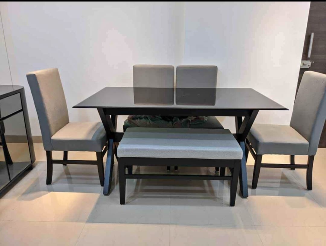 Teak wood brown color polished Table foot rest wooden brown color polished frame of fabric grey color chair 4.5'L x 3'W x 2.5'H table and 4'L x1.5'W 2 seater cushion fabric seat 6 seater home, hotel, restaurant dining table set