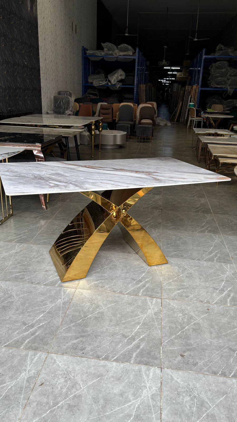 SS frame rose gold finish X shape base white color onxy marble on top 6 seater home, hotel and restaurant designer marble top dining table manufacturer and designer