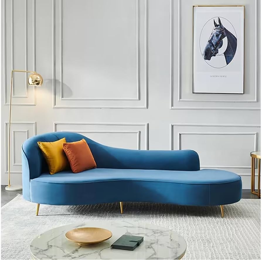 Wooden frame metal powder coated golden finish legs cushion velvet blue color seat designer curve shape back armrest 6 feet home and hotel 3 seater designer lounge sofa manufacturer and designer