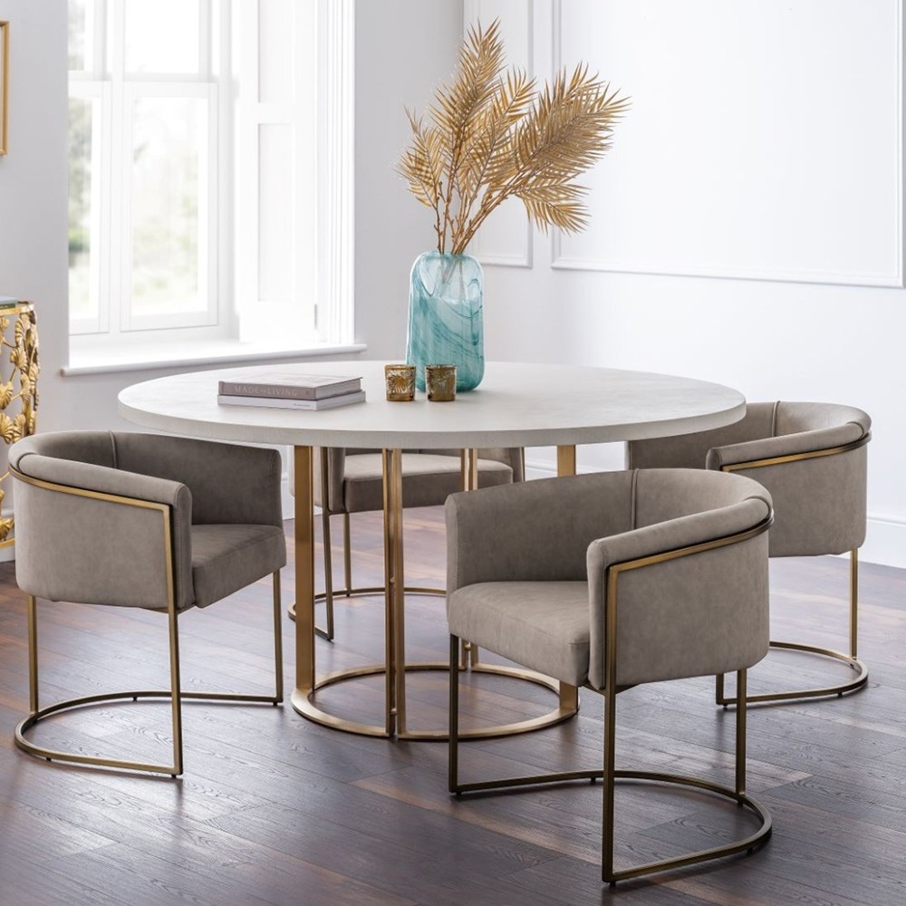 Metal powder coated golden finish round shape base with white color marble stone top in round shape 3'x 3' x 2.5'H metal powder coated golden finish frame cushion velvet ivory color seat round shape medium back with armrest 4 chairs home, hotel and restaurant 4 seater dining table set manufacturer and designer